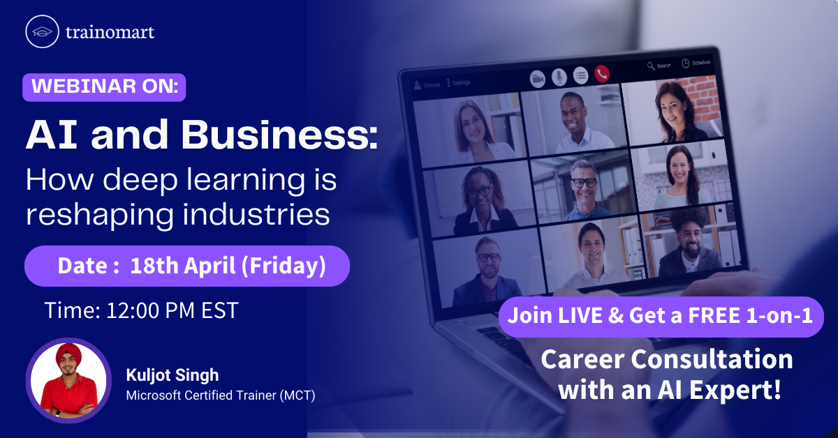Trainomart continues its mission of providing top-quality Global IT Training Solutions with our upcoming webinar, “AI and Business: How Deep Learning is Reshaping Industries”. Join us to learn how cutting-edge technologies are transforming industries worldwide.